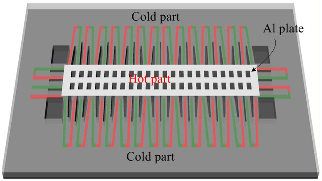 Figure 1 illustrates schematic structure of the energy harvesting thermoelectric micro generator. Area of the generator is about 1,000 × 300 μm2. The thermoelectric generator is constructed by 33 thermocouples in series. Each thermocouple is composed of n-type polysilicon and p-type polysilicon strips. The junctions of n-type and p-type polysilicon strips located on the suspended plate are the hot part of the thermocouples, and the other junctions of n-type and p-type polysilicon strips anchored on the silicon substrate are the cold part of the thermocouples. The output power of the generator depends on the temperature difference between the hot and cold parts. The hot part is suspended for reducing heat sink. Dimensions of each polysilicon strip are 120 μm long, 8 μm wide and 0.2 μm thick.