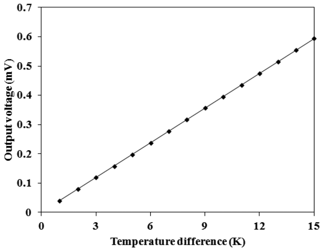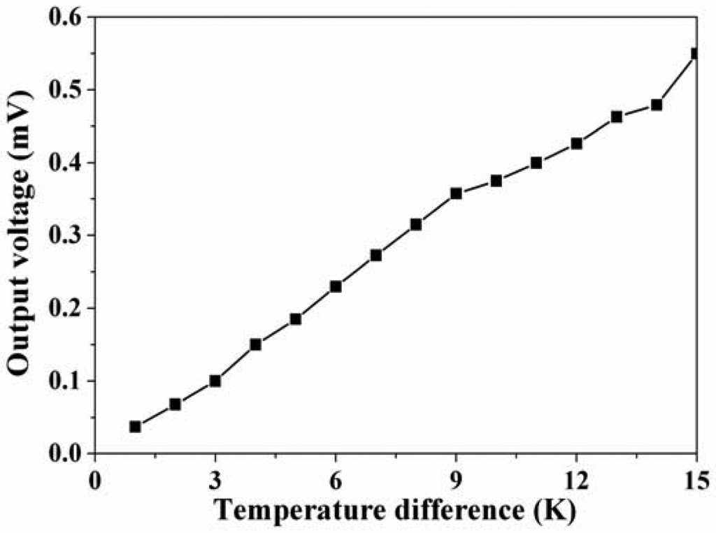 An infrared thermometer detected the temperature difference between the hot and cold parts in the thermoelectric generator. The LCR meter was used to measure the resistance of the thermoelectric generator, and the measured results showed that the resistance of the generator was 8 kΩ. The multifunction electrical meter recorded the output voltage of the thermoelectric generator. Figure 8 shows the measured results of the output voltage for the thermoelectric generator. The results depicted that the output voltage of the thermoelectric generator was about 0.18 mV at the temperature difference of 5 K and about 0.55 mV at the temperature difference of 15 K. The output voltage per area of the thermoelectric generator was about 12.1 mV mm−2 K−1.