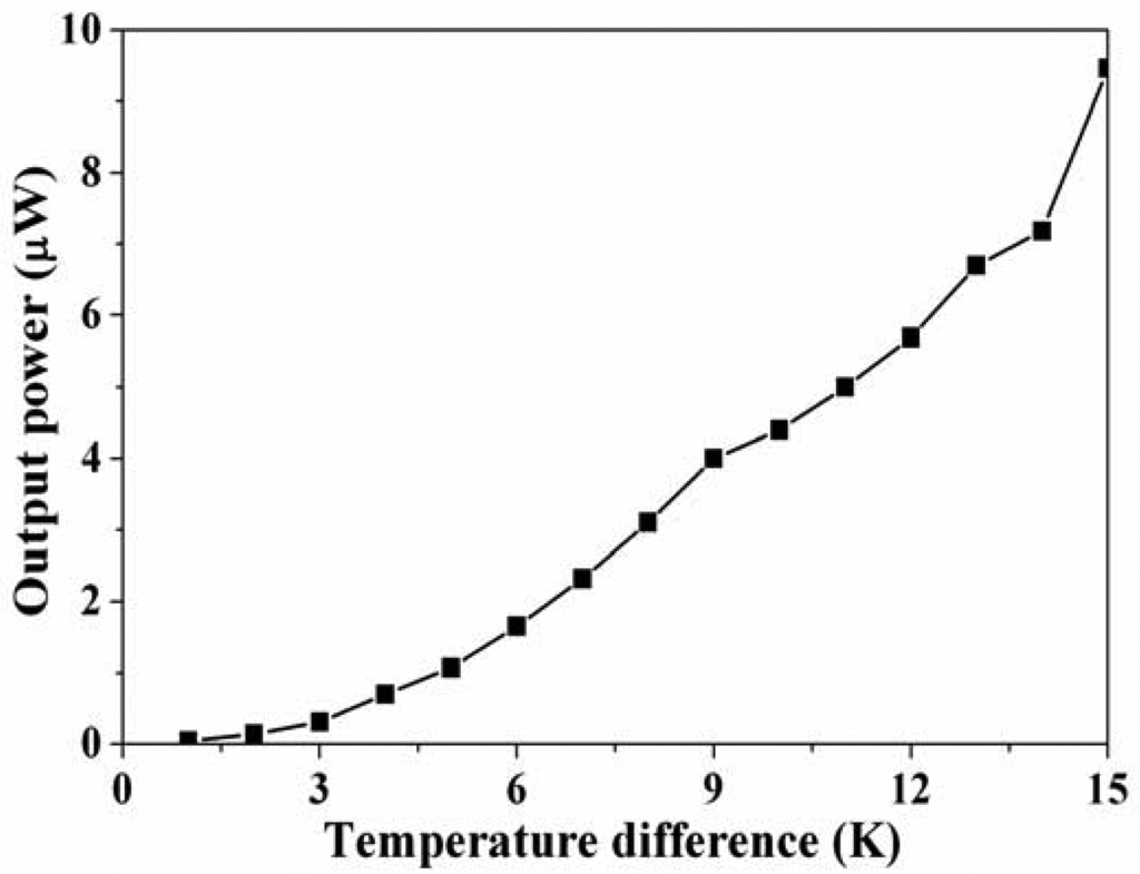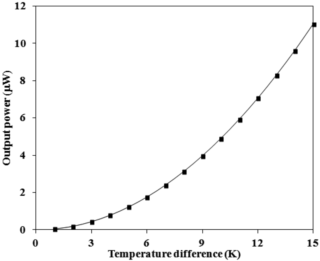 The output power of the thermoelectric generator was evaluated by its output voltage. Substituting the measured output voltage in Figure 8 and the resistance R = 8 kΩ into Equation (2), the maximum output power of the thermoelectric generator was obtained. Figure 9 shows the maximum output power of the energy harvesting thermoelectric generator. The results showed that the output power of the thermoelectric generator was about 1.1 μW as the temperature difference of 5 K and was about 9.4 μW as the temperature difference of 15 K. The power factor of the thermoelectric generator was 1.4 × 10−2 μW mm−2 K−2. A comparison with the simulated results in Figure 3, the simulated output power was 11.03 μW at the temperature difference of 15 K, so the percentage of error was about 14%, in which resulted from the evaluated error of Seebeck coefficient in the thermocouples.