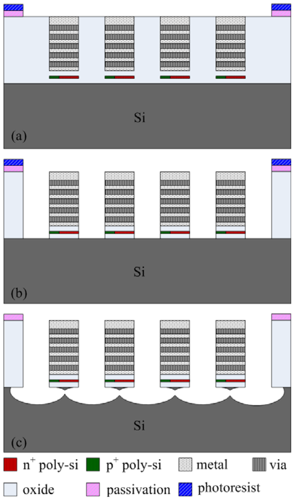 The commercial 0.35 μm CMOS process of Taiwan Semiconductor Manufacturing Company (TSMC) was utilized to fabricate the energy harvesting thermoelectric generator. Figure 4 presents the fabrication flow of the energy harvesting thermoelectric generator. Figure 4(a) illustrates the cross-section of the thermoelectric generator after completion of the CMOS process. The thermoelectric generator required a post-process to release the suspended structures of the hot part in order to reduce heat-sinking of the hot part.
