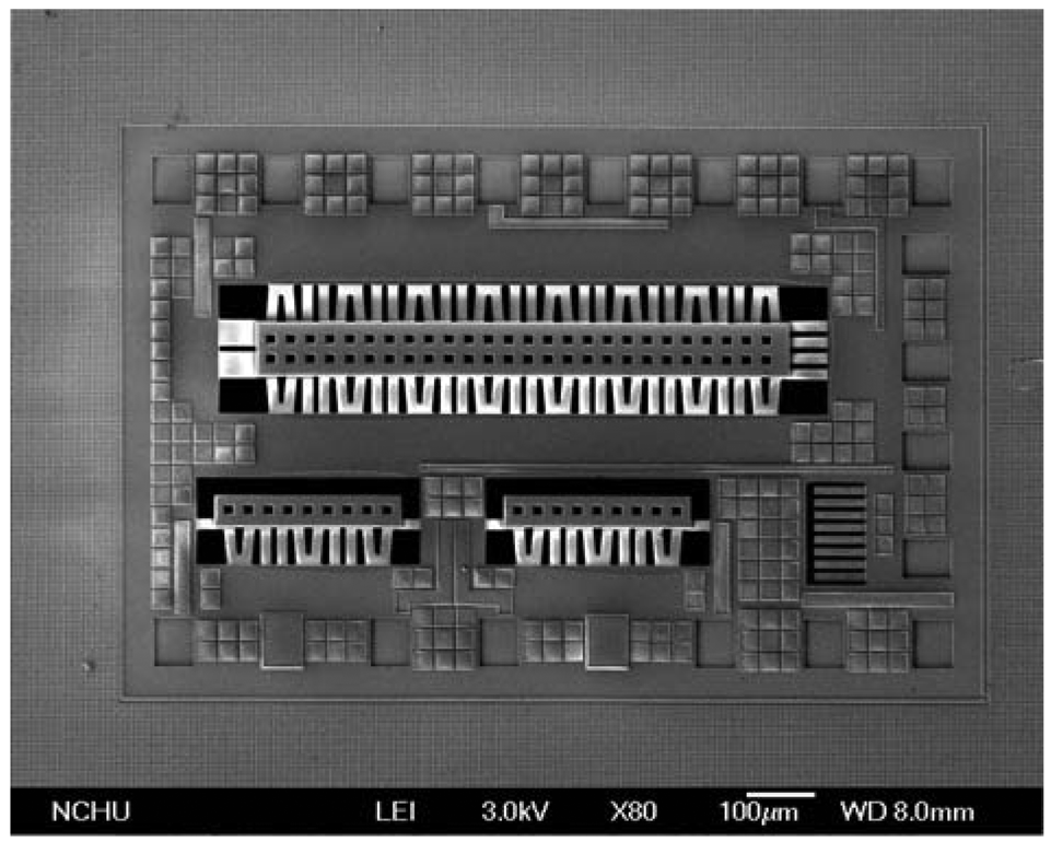 - Kao, P.H.; Dai, C.L.; Hsu, C.C.; Lee, C.Y. Fabrication and characterization of a tunable in-plane resonator with low driving voltage. Sensors 2009, 9, 2062–2075. [Google Scholar]