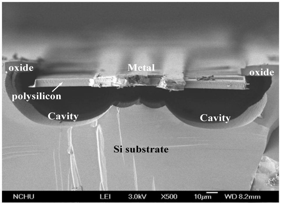 The post-processing involves two steps: one removes silicon dioxide and the other etches the silicon substrate. Figure 4(b) shows that the silicon dioxide is removed. Reactive ion etching (RIE) with CHF3/O2 is used to etch the sacrificial oxide layer, and to expose the silicon substrate. Figure 4(c) shows that the silicon substrate is removed. An RIE dry etching with XeF2 is employed to etch the silicon substrate, and to obtain the suspended structure of hot part in the generator. Figure 5 displays a scanning electron microscope (SEM) image of the energy harvesting thermoelectric generator after the post-process. In order to understand the suspended plate released condition, the thermoelectric generator was cut along its cross-section. Figure 6 shows an SEM image of cross-sectional view for the energy harvesting thermoelectric generator. The suspended plat in the generator was released completely.