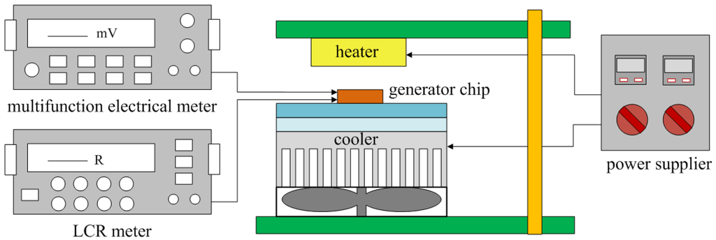 The performance of the energy harvesting thermoelectric generator was measured by a heater, a cooler, an LCR meter and a multifunction electrical meter. Figure 7 shows the measurement setup of the thermoelectric generator. The heater provided a heat source to the thermoelectric generator, and the cooler was used to increase a heat sink for the cold part in the generator.