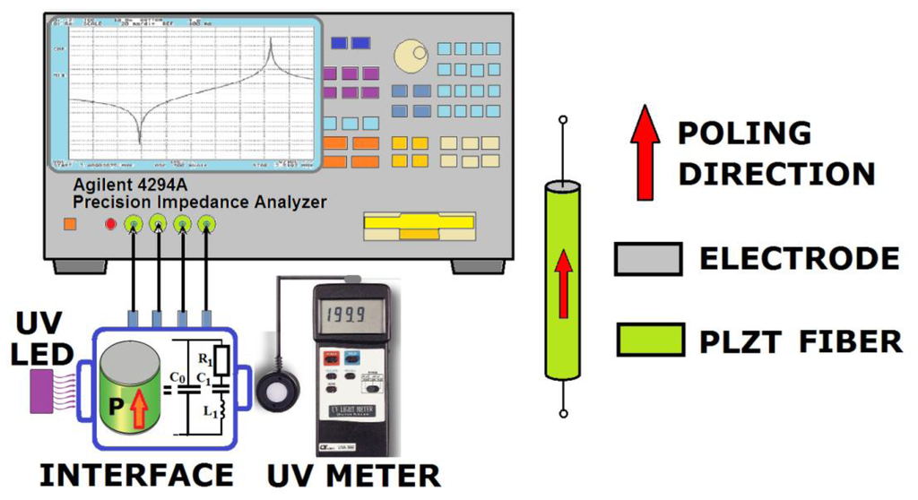 Elastic, dielectric and piezoelectric coefficients are obtained from impedance spectrum analysis using a modified resonant method [19]. Free permittivity εT33 is determined from a sample's capacitance at 1 kHz. Piezoelectric coefficients and elastic constants can be significantly increased by the light illumination but other studied properties change much less. For characterization of their ferroelectric properties PLZT fibers were cut into 3.5 mm long pieces and placed vertically into an Agilent 16047E sample holder. Both fiber ends were painted with silver conductive paste P-120 ITME to make electrical contact (Figure 1). Subsequently they were poled in silicon oil with 3 kV/mm, 130 °C for 5 min. The illumination was generated by UV LEDs placed at the center of the fiber to provide uniform illumination because the LED light spot is just 3.5 mm in diameter.