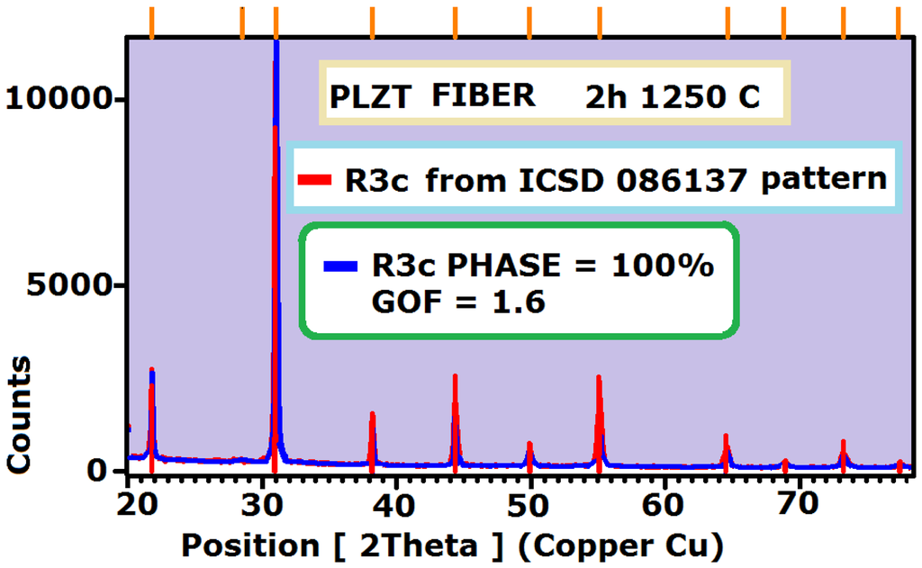 In the obtained diffraction diagrams all indexes connected with the perovskite structure were assigned (Figure 3). Additionally the XRD examination of the fabricated PLZT fibers revealed exclusively stabilized, rhombohedral phase (ICSD collection code: 086137), because of a very low value of goodness fit parameter GOF = 1.6 which evaluates how well the Rietveld model fits the entire data set (a GOF = 1 means the model is as good as possible). As was assumed earlier, an addition of PZ + Z powder creates an atmosphere which prevents lead evaporation during high temperature sintering. Such a protection was successful despite high lead diffusivity, even when the sintering temperature is as high as 1,250 °C [17]. It is worth to emphasize, that the blue peaks at angle 2Θ = 31° in the x-ray diffraction plot were relatively high in comparison to PDF pattern, this fact could be an indication of small texturing created during the extrusion process (Figure 3).