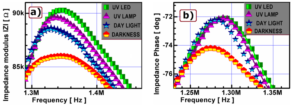 Figure 4(a,b) shows the complex impedance spectra of PLZT fibers measured near the antiresonant frequency for the different light sources. The changes in light conditions give a distinct effect on impedance maxima shape (Figure 4(a,b)). The impedance modulus and the phase peak are broad in shape for dark and narrow in shape for illuminated fiber. The difference in modulus value is equal to 5 kΩ between UV LED illuminated fiber and not illuminated (dark) one (Figure 4(a)). Under the same conditions a marked change in phase value equal to 3 degrees (Figure 4(b) could be observed. The impedance maxima for the different light sources differ for amplitude peak and phase changes, by 2 kΩ in amplitude and 0.5 degree in phase, respectively. In conclusion the applied UV LED illumination caused the highest increase of impedance up to approx. 6% of its dark value.
