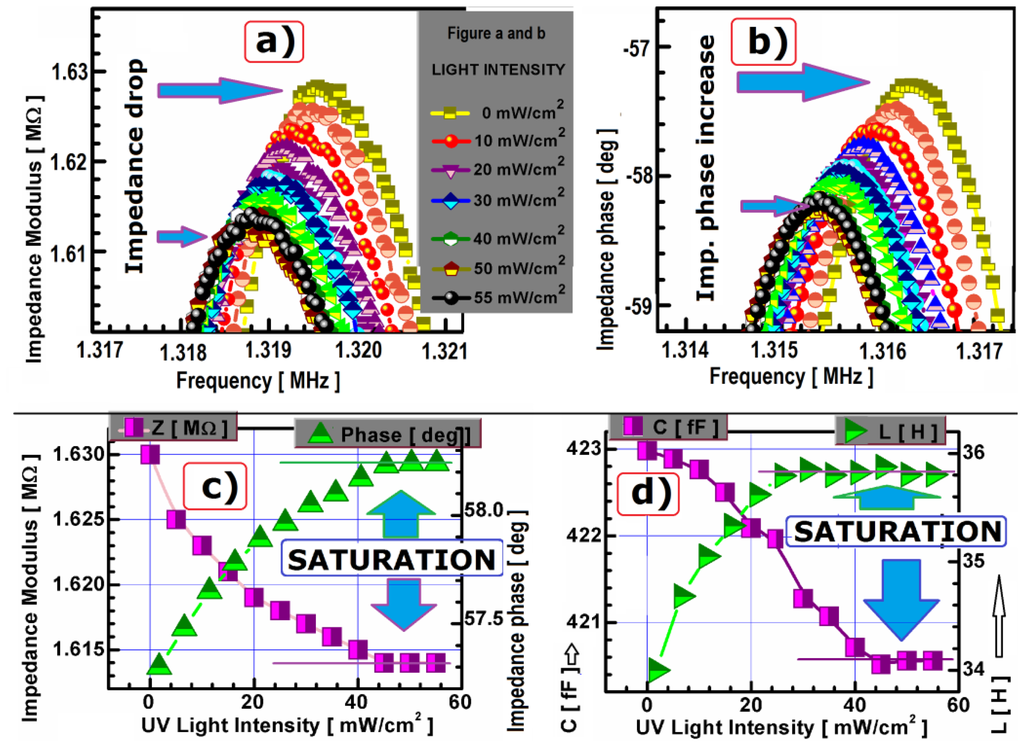 The piezoelectric fibers made from PLZT powder exhibit apparent difference among characteristics proportional to UV LED illuminance (Figure 5). Surprisingly, when they are illuminated the small intensity impedance modulus peak differs markedly (2kΩ in modulus and 0.2 deg in phase for 0.5 mW/cm2 light change). When increasing the light intensity stepwise, the differences in impedance modulus and phase angle become smaller and finally disappear above 40 mW/cm2 light intensity (presented in detail in Figure 5(c) and indicated by the horizontal arrows in the Figure 5(a,b)).