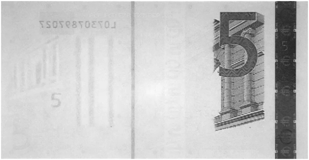 Despite different approaches having been presented in the literature, most of them do not take into account the Euro banknotes or the authentication task. Moreover, some approaches have been tested only on simulated data. All the techniques above could be adapted to other currencies (e.g., the Euro) for the recognition task, but their adaptation to counterfeit detection is not straightforward, because, under visible light, the counterfeit banknotes usually look identical to the valid ones. Hence, a system designed for a specific currency (e.g., the Euro) cannot be employed, as it is for other currencies (e.g., Sterling, Turkish Lira); each currency has its own specific features to be exploited for counterfeit detection. Typically, those features strongly differ from one currency to another. In the Euro banknotes, there are several features that can be used to detect forgeries: the sheet, the watermarks, the particular inks with different behavior in visible, infrared and ultraviolet lights, etc. (see [] for a full overview). Different than other approaches, in the proposed system, the infrared (IR) technology has been exploited, since it can provide good and robust features for counterfeit detection of Euro banknotes. Examples of Euro banknotes acquired with the IR light are shown in Figures 1 and 2. The two different inks present on the Euro banknotes (one reflective to IR and one absorbing IR) allow one to obtain powerful features for the involved tasks (i.e., counterfeit detection and value recognition).