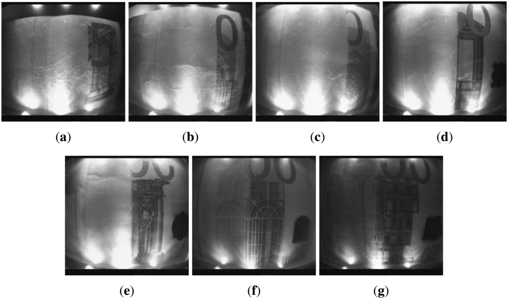 The authors of [] make use of light transmittance and pattern recognition techniques to classify the value of banknotes. The method requires the banknote to pass through light emitters (LED) and receivers (photo transistors) placed on the opposite side. Hence, the system requires motor actuators and other mechanical parts. Moreover, the method can be simply deceived by counterfeit banknotes (not handled by the authors).