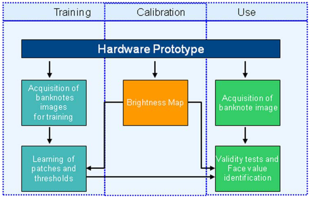 The overall scheme of the developed algorithm for infrared-based counterfeit detection and currency value recognition is shown in Figure 3. The overall pipeline consists of three main blocks: calibration, training and use module. To build a low cost cash validator, we need to consider different constraints (i.e., very low memory usage, a low cost acquisition camera, etc.), which make the recognition and counterfeit detection tasks more challenging. The proposed software solution has been designed, taking also into account low cost hardware with limited resources, detailed in Section 4.