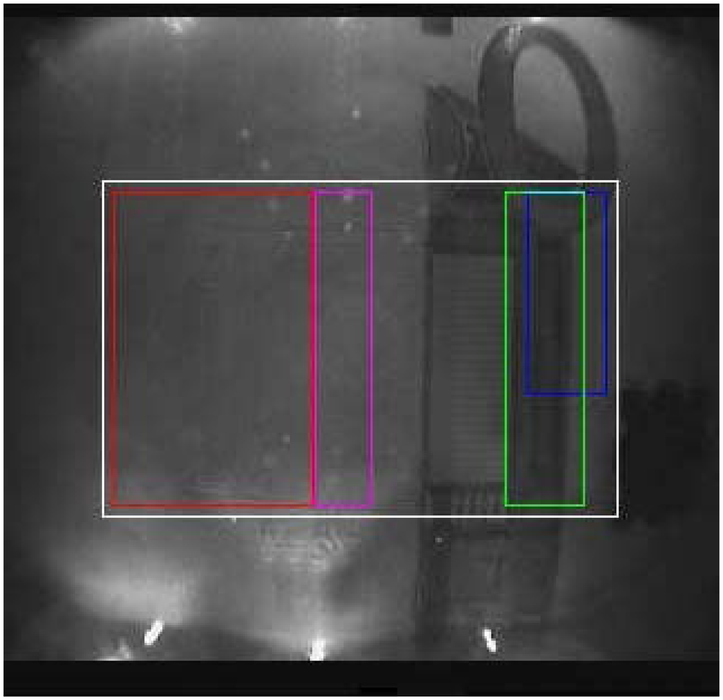 Once the image has been corrected from the non-uniform LED illumination problems (see Section 3.1), a suitable threshold needs to be found according to the actual input data. In our experiments, we have noticed that the average gray value (indicated as MeanRef) of the blue region shown in Figure 4 can be robustly used for this purpose. To check the genuineness, we compute the percentage of pixels inside the green region with a gray value below MeanRef (i.e., percLT), together with the percentage of pixels inside the magenta and red regions with a gray value above MeanRef (i.e., percGT). The acquired banknotes are hence classified as genuine by using the following formula:
