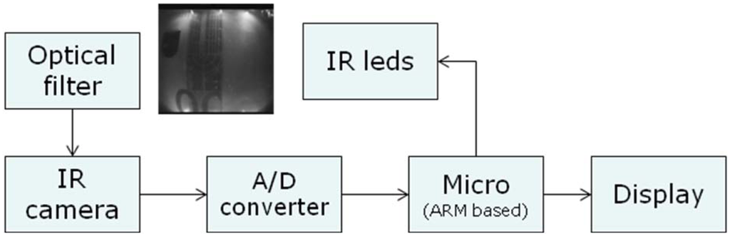 The Infrared LEDs (IR LEDs block) illuminate the scene. This block is composed by six LEDs placed around the proscenium (i.e., the area where the banknote is placed). The illumination is not uniform in the real system. Hence, a calibration is needed to take into account the non-uniformity and the performance decay during the system life (see Section 3.1). An optical filter is inserted to avoid an external light source from influencing the image acquisition system. The filter is placed on top of the infrared camera (IR camera block) that acquires the image. The camera is a common low cost camera with CCTV output. Since the output is analog, an analog to digital converter (A/D converter block) is used to obtain a digital standardized format (i.e., CCIR – 656). The digital image is then processed by the microprocessor. In the prototype, we have used a main board AT MEL AT91SAM9XE256 with aARM926EJ — S™ processor at 200 MHz and 256 KB internal high-speed flash memory, which is used to store the program instructions. The board includes also an Image Sensor Interface (ISI) port able to capture video sequences compliant with the standard ITU-R BT 601/656. The software to be run in the proposed hardware is composed by the control logic for the entire subsystems (e.g., IR led, IR camera settings, Display, etc.) and the related algorithms (for both validation and classification) described in Section 3. The prototype has been also equipped with 4 M byte of external SRAM memory, since the microprocessor contains only 32 Kbyte of internal SRAM.