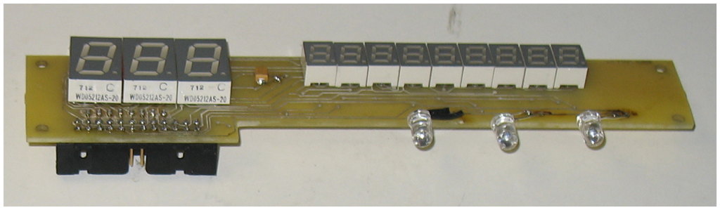 In Figure 7, the main board and the other hardware components composing the prototype are shown. In the center, there is the ATMEL microprocessor; on the right side, there is the A/D converter; in the upper part, there is the external SRAM memory; in the lower/right side, there is the power supply. The display used to show the output of validation and recognition of banknotes is composed by several eight-segment displays (Figure 8): three are used to show the banknote size, while eight are used to show the validity and other service messages. The final prototype in operation is shown in Figure 9. The overall hardware has an estimated cost of 30$ when produced in a large scale.