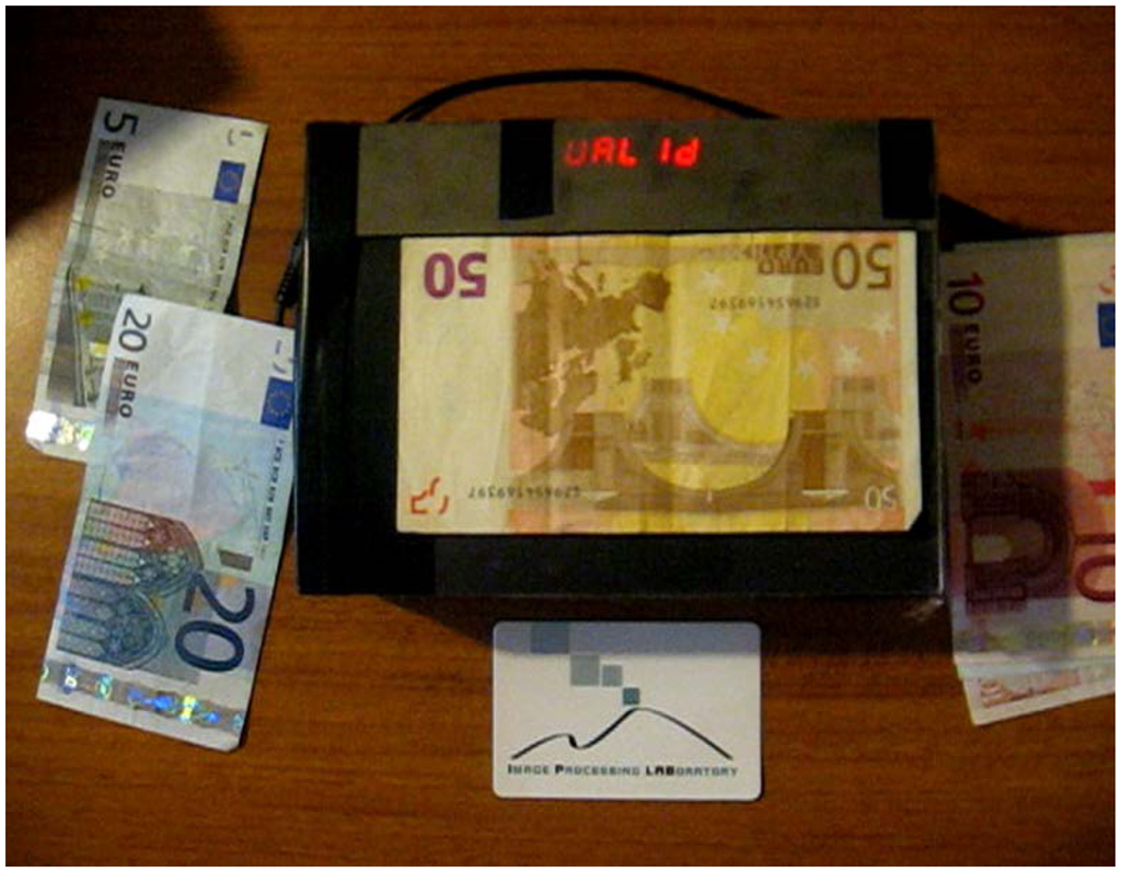 There are different motivations to produce low cost consumer validator machines for banknotes. Among others, there is the difficulty for blind and visually impaired people to recognize both the value and validity of banknotes. The World Health Organization (WHO) estimated that there were more than160 million visually impaired people in the world in 2002, which equates to more than 2.5% of the total population. Specifically, the study of the WHO reported that there were 124 million people with low vision and that 37 million were blind []. Although blind and visually impaired people can make a first screening on the value of the banknotes by taking into account the size of the different banknote values, there is no way for them to check for the validity and for forgeries in most cases. It should be noted that the validation of banknotes is a challenging task also for people without vision problems; indeed, under visible light, the counterfeit banknotes are usually identical to the valid ones. Since the encoding of new features to make the actual currencies “blind-friendly” has a high cost for the treasury departments of different countries [], consumer cash validators can be very useful in bypassing this problem. Despite other works having addressed the problem of money recognition specifically for the visually impaired [, ], to the best of our knowledge, there are only a few works considering the problem of the validity of the money, as well as the problem of prototyping low cost hardware in this context.