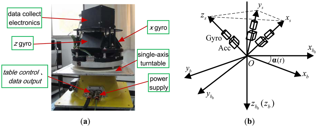 We denote by b the body frame, where xb lies along the projection of gyro sensitive axis xs on the turntable plane, zb lies along the turntable shaft center and downwards vertically to the turntable plane, and yb lies on the turntable plane to form an orthogonal frame. The b frame is rotated along with the turntable rotation. We define the b0 frame when axis xb coincides with the photoelectric null indicator.