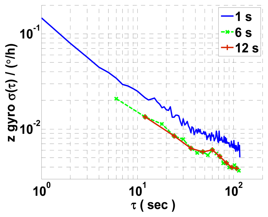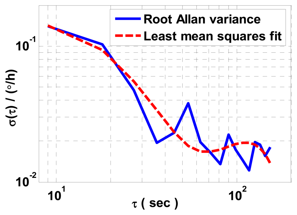 Using least mean squares fit, a value of is obtained for the average ARW coefficient of x and z gyros. In view of the results of the theoretical analysis in [5] and the experimental tests in [2,6], the estimated average ARW coefficient here is dubious and incorrect. Therefore, two problems have to be addressed.