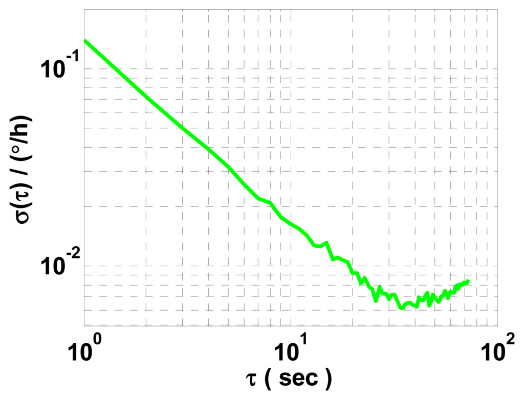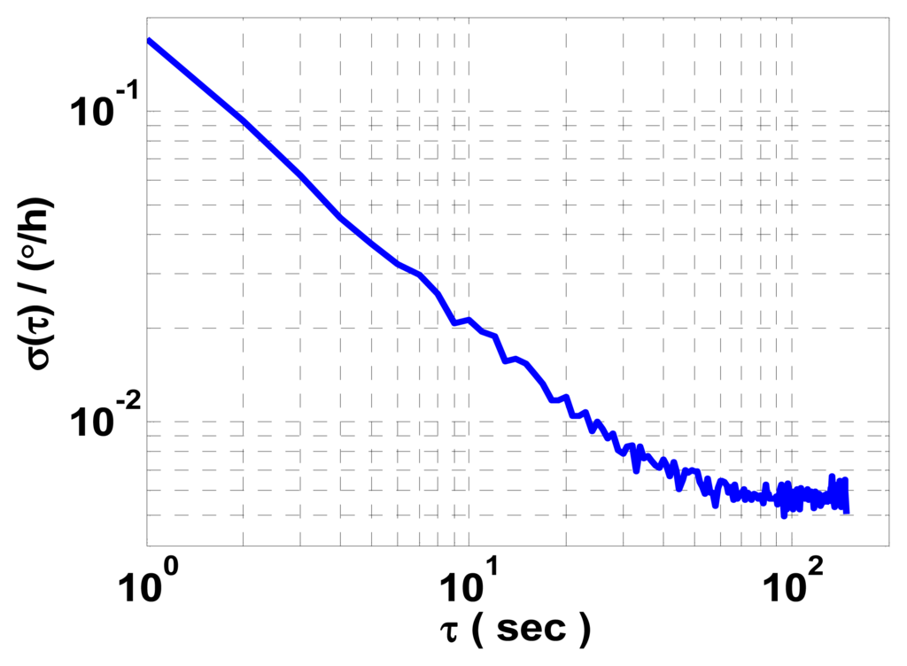 (1) For data collected when the turntable is stationary, the ARW coefficient of the mechanically dithered RLG can be estimated after simple post-processing of the measured data with sampling the data records at a time interval τ0 = 1 s. To provide a reference for the FOS-based method, the average ARW coefficient of x and z mechanically dithered RLGs is estimated by AVAR after taking difference between the two measured data. Figure 4 shows a log-log plot of σ(τ) versus τ of the resultant gyro noise difference data under stationary condition, with an AVAR maximum estimation percentage error of 10%.