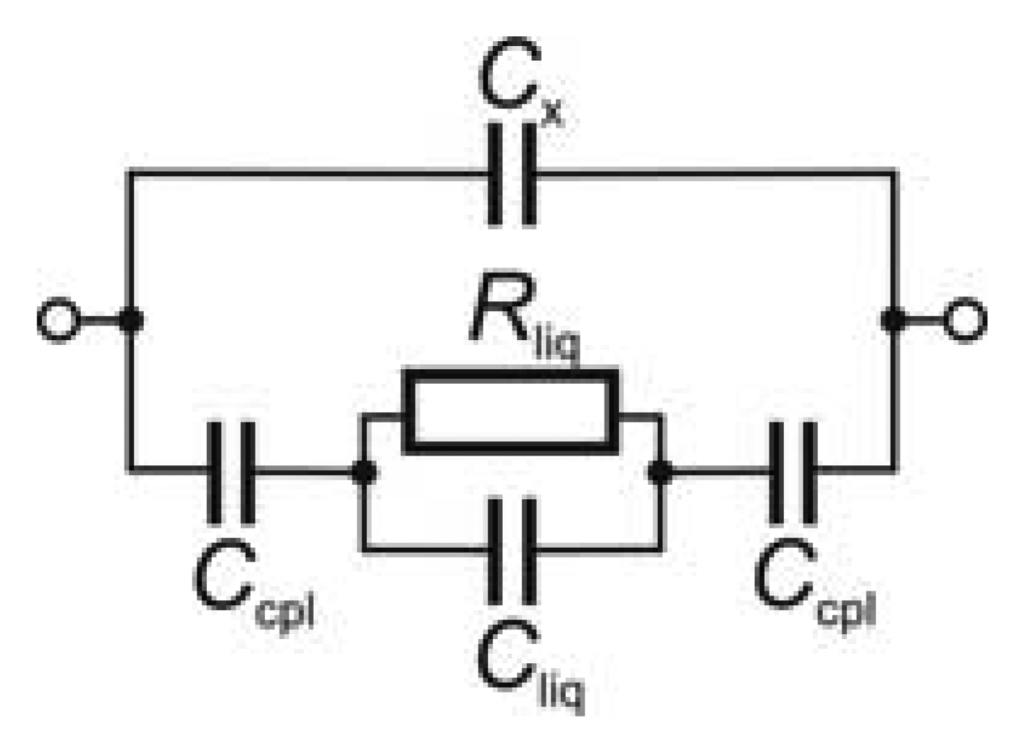 A simplified electric equivalent circuit of a contactless impedance cell, permitting sufficiently detailed theoretical description of the cell operation, is depicted in Figure 1. A high-frequency alternating (usually sine-wave) voltage is applied to one electrode and the interaction of the alternating electrical field with the test medium is monitored at the other electrode, usually in the form of an alternating current signal. The two electrodes are separated from the test medium (usually liquid) by a dielectric layer and represent two capacitors characterized by coupling capacitance Ccpl; Ccpl depends predominantly on the thickness and permittivity of the dielectric layer. The electrical behaviour of the test medium appears as a parallel combination of the liquid resistance (Rliq) and the liquid capacitance (Cliq). Part of the electrical energy applied always strays from the test medium, passes along the surface of the dielectric or through its interior and appears as stray (parasitic) capacitance Cx, parallel to the main passageway. The parasitic effect of the stray capacitance is sometimes eliminated by placing a shielding foil between the electrodes [9,10].