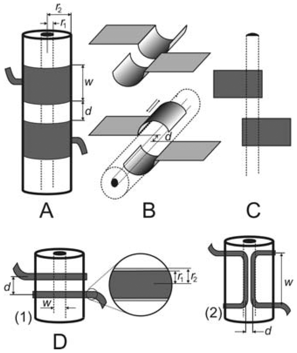 Tubular geometries (Figure 2A) have so far been studied most thoroughly; the Rliq and Ccpl values in Equation (3) can be expressed as: