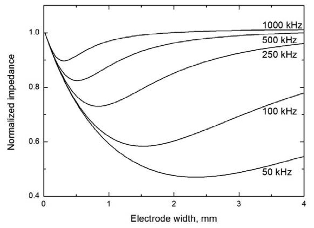 It has been found [16] that the width of tubular electrodes (Figure 2A) has a small effect on the magnitude of the measured signal. On the other hand, the optimum applied voltage frequency strongly depends on the electrode width and equals from about 400 to 600 kHz for narrow (2 mm) electrodes [11,19] and is substantially lower for wider ones, 20 to 40 kHz [16] or 40 to 100 kHz [20] for electrodes 15 to 50 mm wide, respectively. These observations should be explained by theoretical model based on the solution of the equivalent circuit (Figure 1) with the electrode width as a variable. The performed simulation (see Figure 4) indicates that the dependence of the cell impedance on the electrode width passes through a minimum and the current signal follows a trajectory characterized by the lowest impedance on passage through the cell. Consequently, the signal does not pass through the whole electrode width, w, but only through a small part called the effective width, weff[21]. It can be seen in Figure 4 that the effective electrode width significantly varies with varying signal frequency, decreasing with increasing frequency. Its value is smaller than 1 mm for frequencies above 200 kHz and reaches only tenths of a millimetre at frequencies around 1 MHz. For this reason, the effective width is often neglected and the only gap is considered in expression of the cell resistance Rliq. The overall length of the detection space equals 2 weff + d and determines the effective detector volume, which depends on the signal frequency. Cells with narrow electrodes can be used at high frequencies without decreasing the detection sensitivity; wide electrodes permit the use of lower frequencies. These conclusions are confirmed by the results published in reference [22].
