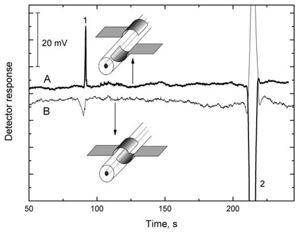 The effect of the width of the gap between the electrodes has been studied [15] on a cell with semitubular electrodes (Figure 2B), one electrode being fixed and the other, opposite, electrode being shifted along the capillary surface. The detection sensitivity, defined as the ratio of the electric current flowing through the cell and specific conductance of solution, I/κ, increases with decreasing gap width, d, between the electrodes [I/κ is proportional to 1/d as follows from Equations (6) and (7)]. The detection sensitivity increases with decreasing d from 3 mm up to 0.5 mm. There is a negligible change in the detection sensitivity within the gap width interval from 1 to 0 mm but the sensitivity begins to decrease rapidly when the electrodes gradually become superimposed. This decrease is due to the change in the cell response character—the effect of the capacitance component of solution on the impedance Z1 increases and that of the resistance component decreases. When the electrodes are placed opposite one another, the cell becomes a virtually pure permittivity detector whose signal is determined predominantly by the change in the test solution permittivity and substantially less by the change in its conductivity. The change in the character of the detector is clearly demonstrated on the electropherogram of the potassium ion and water gap in Figure 5. The response to passage of the potassium ion is high in the conductivity arrangement of the detection cell, because the zone has higher conductivity than conductivity of background electrolyte and the passage of the low-conductivity water gap is registered as a substantial reduction in the response. In the permittivity arrangement of the detection cell, the potassium ion reduces the permittivity of the zone, leading to a reduction in the response, but the response on passage of the water zone is high because the permittivity is higher than permittivity of background electrolyte.