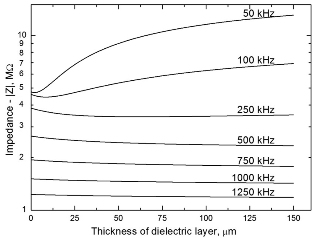 The effect of the thickness of the dielectric on the impedance of contactless detectors can be modeled, see Figure 6. It follows from the model based on an equivalent circuit applied to a tubular cell (Figure 2A) that the impedance of the sensor increases substantially with the thickness of the dielectric only at low alternating signal frequencies. At high frequencies, the impedance is practically independent of the thickness of the dielectric (with increasing frequency, the resistance of the condenser, Zc = −i/2πfCcpl, decreases and the dominant component contributing to the total impedance is then the ohmic resistance of the solution in the capillary, which is not dependent on the frequency). It thus unambiguously follows that impedance measurements can be successfully performed even in thick-walled capillaries assuming that strong capacitive coupling is ensured (high Ccpl), with simultaneous use of a high-frequency alternating signal. It should also be pointed out that the frequency from which the impedance ceases to depend on the thickness of the dielectric also varies substantially with the magnitude of the stray capacitance, Cx.