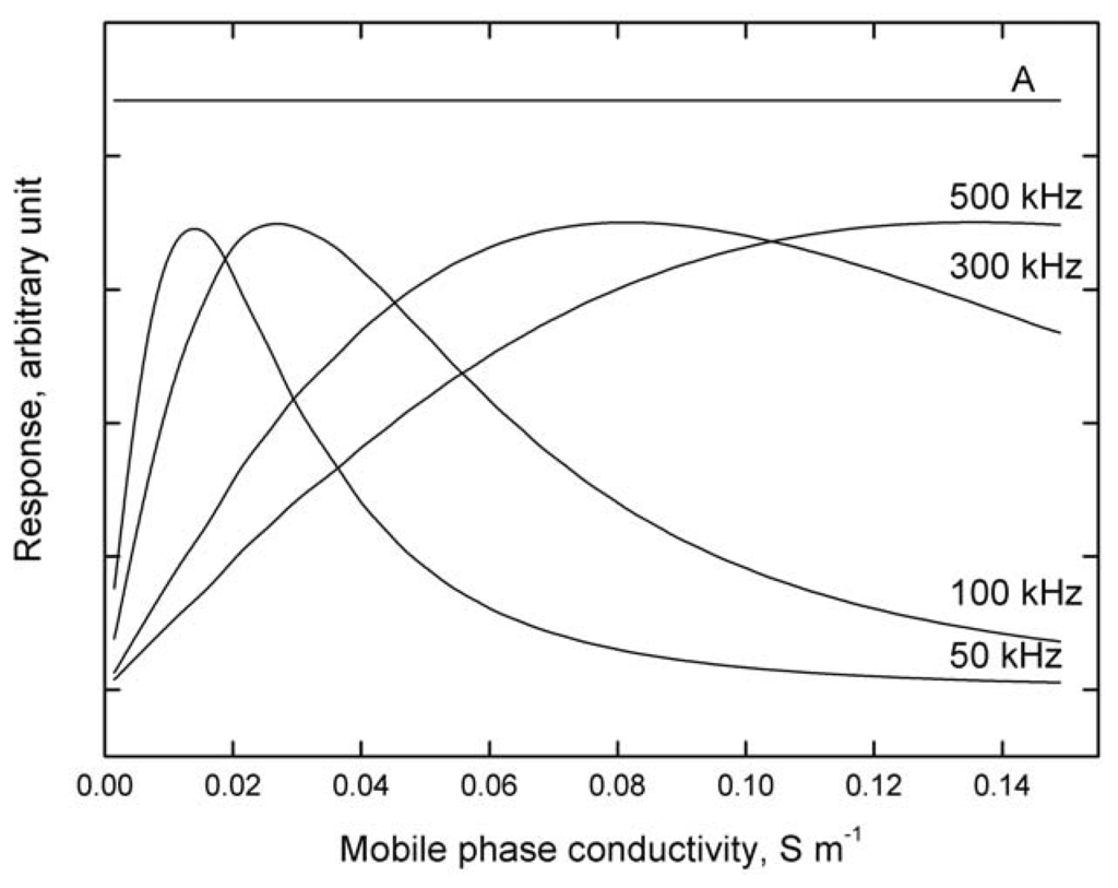 It can be seen that the cell behavior depends on a number of experimental parameters and it should be emphasized that all these parameters affect one another, so that they must be considered together when studying the behavior of a particular cell under particular conditions. It is also evident that the set of experimental conditions determines whether the resistance term of Equation (1) predominates—this is the case of the contactless conductivity detection which is mostly used at present, or the capacitance is more important (dielectrometry).