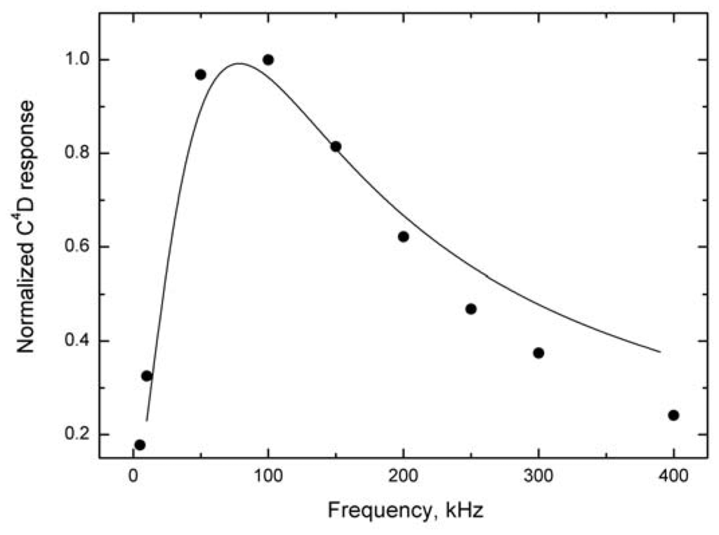 Our measurements indicate that the model employed for tubular cells is also applicable without substantial limitations to cells with insulated wire electrodes [26] oriented across the tube, see Figure 2D (1). For illustration, the model and experimental response—frequency dependences for a cell with wire electrodes placed at right angles for constant Δκ of the solution are compared in Figure 8. The decrease in the cell response at high frequencies is caused by the increasing influence of the stray capacitance; the operational characteristics of the electronic components used in the detector electronics can also influence the response as mentioned above (the limited bandwidth of operational amplifier). These cells have also been employed for FIA determination of total inorganic carbon in aqueous solutions [30].