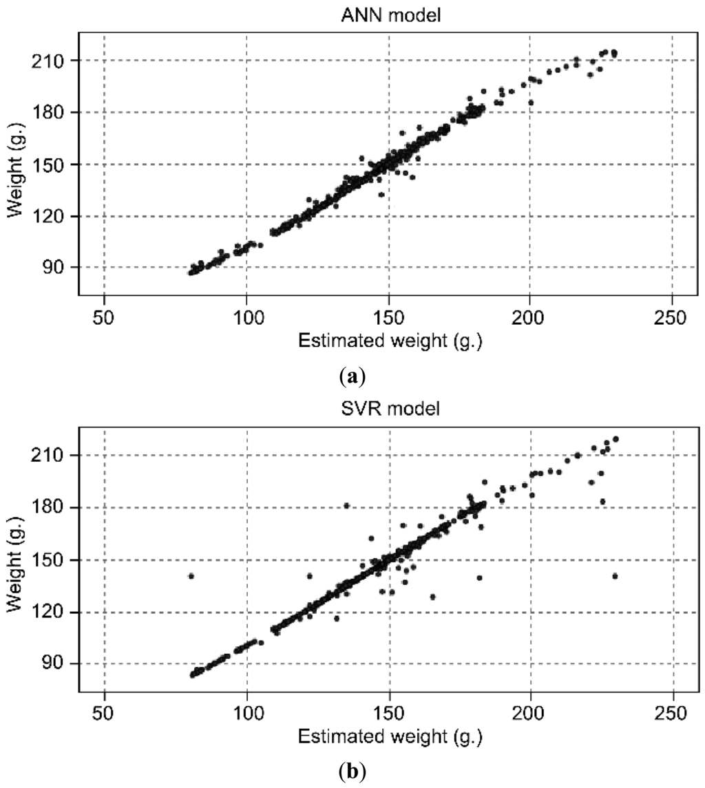 Both techniques (ANN and SVN) offer good accuracy, according to the results obtained with the validation set. 98.5% of accuracy with ANN, in comparison with a 97.3% of accuracy with an AVR model, using the same input and validation set for both models. This accuracy comparison is done with the best models obtained with the two techniques. Figure 2 depicted a comparison between real and estimated weight using ANN and SVR models.