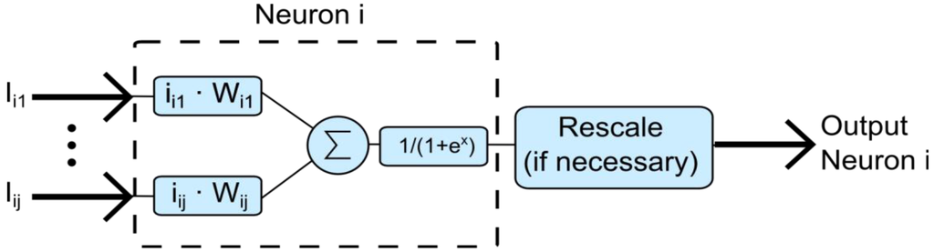 Different neural networks were evaluated. Finally, a multilayer perceptron (MLP) model was chosen. The multilayer perceptron network consists of multiple layers of neurons, each one with a sigmoid transfer function. Every neuron is weighed and connected to all the neurons of the previous layer. This is depicted in Figure 3, where Wij is a multiplier factor that represents the importance of the input j.