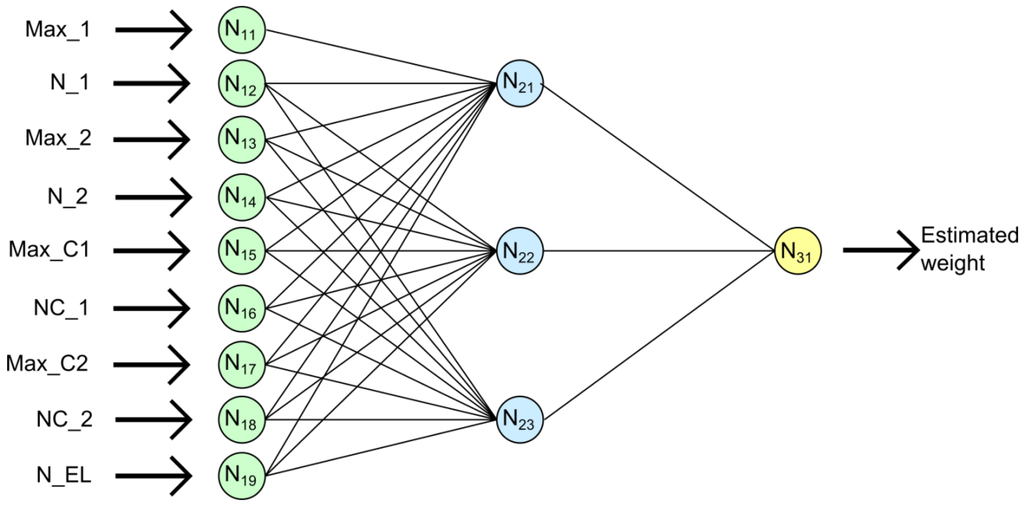 In this case, the proposed network has a structure of nine neurons in the input layer (one per input), three neurons in one hidden layer, and one neuron in the output layer. The output neuron offers as output an estimation of the weight of the studied animal that produces the evaluated pattern. This neural network is depicted in Figure 4.