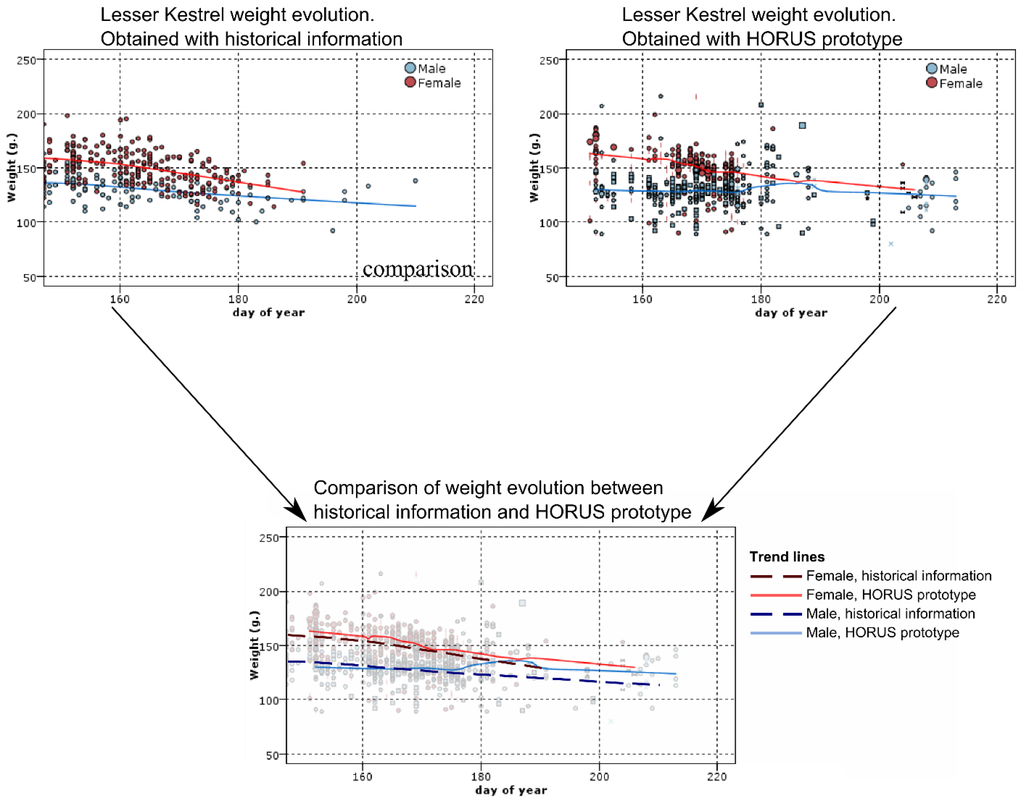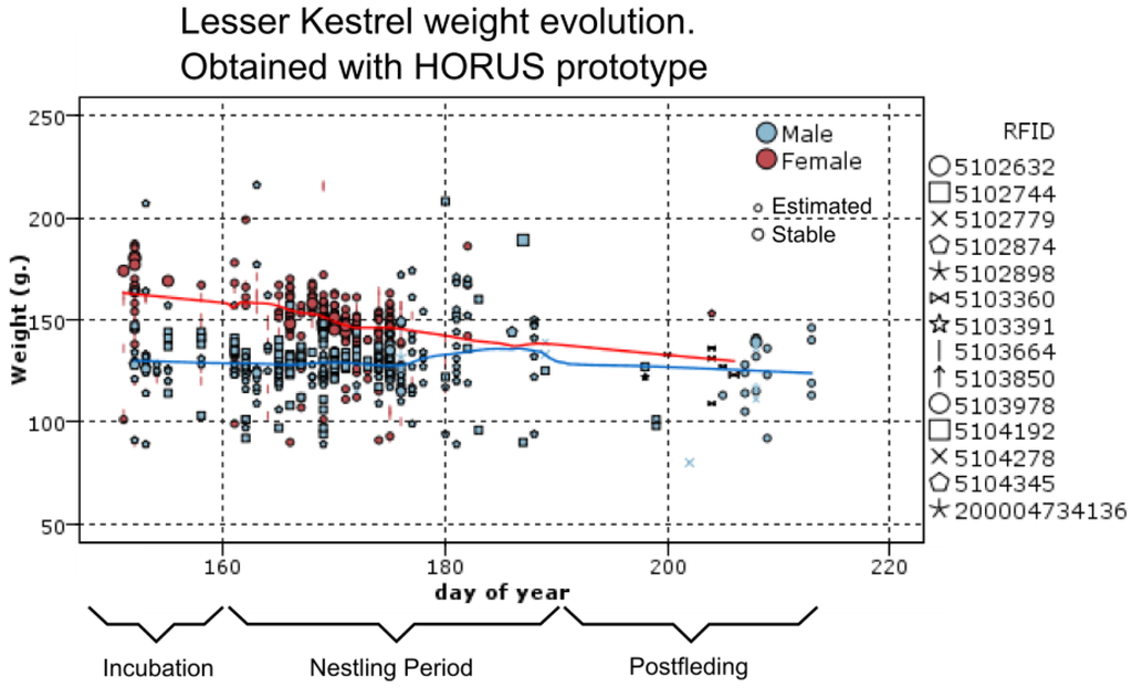 As it can be seen, the results obtained from the historical data are similar to the ones obtained with the proposed prototype. The HORUS prototype offers in a year similar data to that obtained in 24 years of manual captures. The proposed system would allow the researchers to estimate the cost of breeding in terms of bodyweight loss and the evolution of this parameter during the breeding cycle. This cost is directly associated with the foraging trips to feed the nestlings. The system allows quantifying the number of trips, its duration, and the weight loss by the parents during the trips. With our system, it is possible to measure variations body weight trends among years. Due to the limited acquired data, the manual capturing system does not allow conducting this kind of analysis.