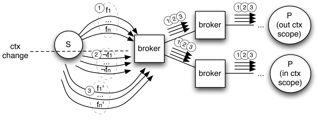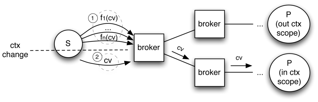 Such functions become regular filters when applied to a given context ctx ∈ ℂ within the brokers. Figure 2 illustrates how flooding is avoided as subscriptions (➀) are updated by propagating context updates (➁).To apply context update and bind it to its correct filters, a subscriber-unique UUID, created by the broker, is added to filters and to context messages. This is necessary to distinguish the same filter if issued by different subscribers and to bind the filter to its correct context when the context function is called. This does not clash with the decoupling offered by P/S systems since it is used only internally by brokers and is comparable to the procedure enacted by other systems that use a multipath topology to resolve the duplicate message problem [27,28].