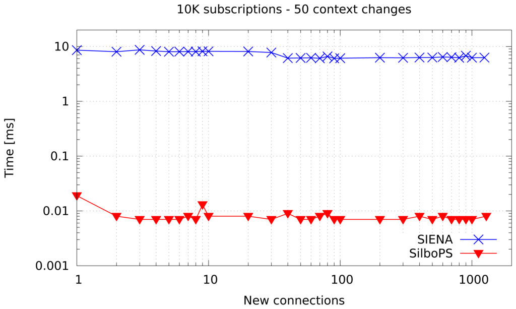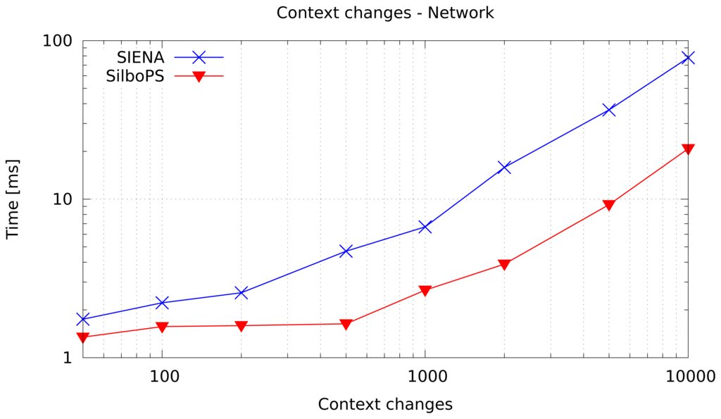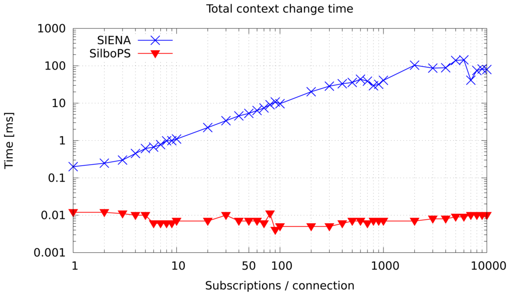 The first experiment is meant to compare the context change cost for the two systems. It performs 50 changes per subscriber on a single broker previously loaded with 10,000 subscriptions (equivalent to 1250 connections). As shown in Figure 7, the operation has a fixed cost in both systems. However, SilboPS outperforms SIENA by three orders of magnitude. The reason is that SIENA has to modify its index entries (removing and adding the filters), instead of updating only the subscriber's context, whereas SilboPS only updates context values.
