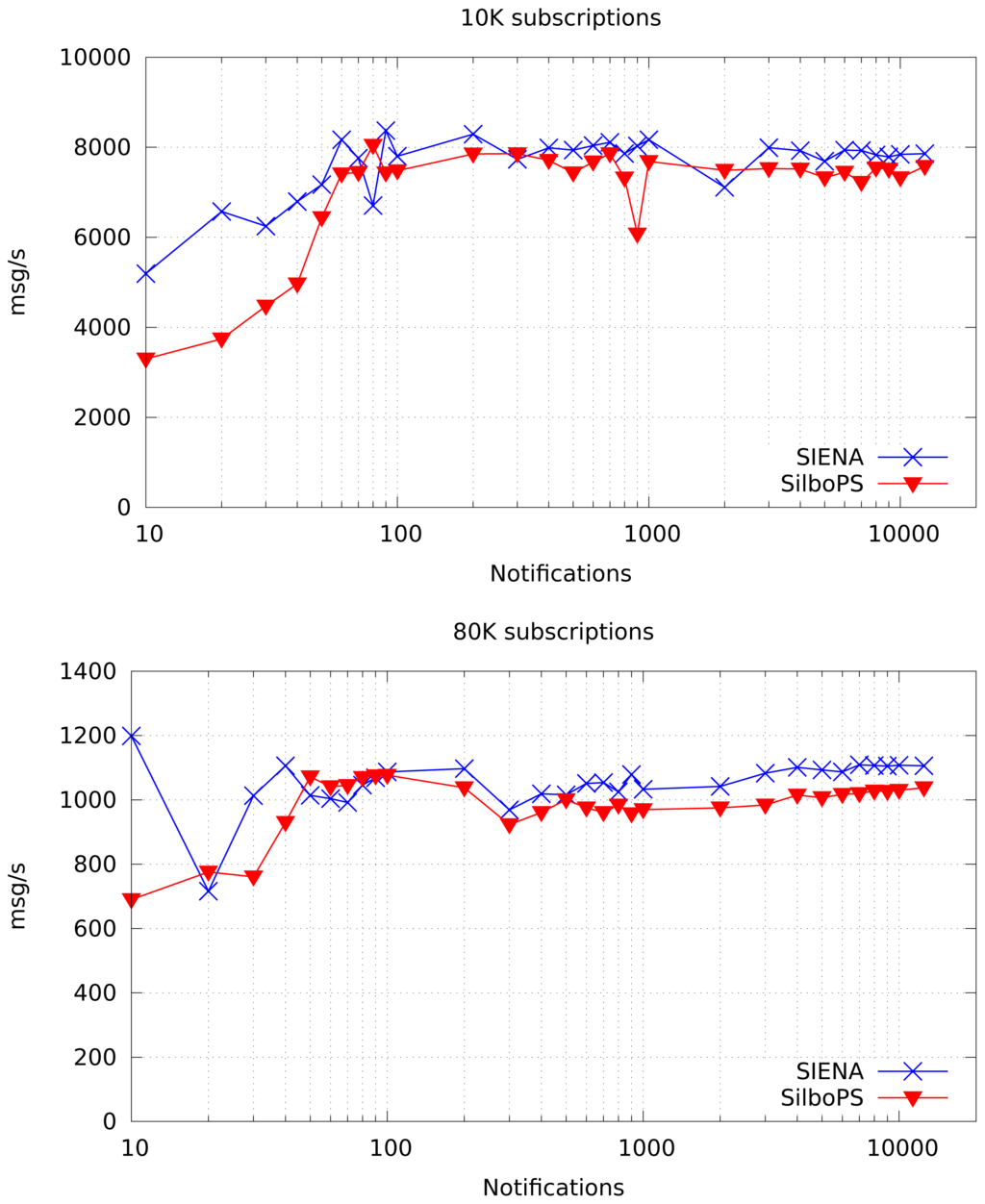 Figure 11 shows notification throughput when the broker is loaded with 10,000 subscriptions in the top chart, and with 80,000 subscriptions in the bottom chart. It is clear that SilboPS introduces a small overhead with respect to SIENA and that maintains the same shape through all the range; this proves our first assumption, stating that filters applied to notifications are stricter than the ones applied to context. As expected, the more notifications we send, the more stable the value is, since the broker queue always has an element and thus the broker saturation point can be reached.