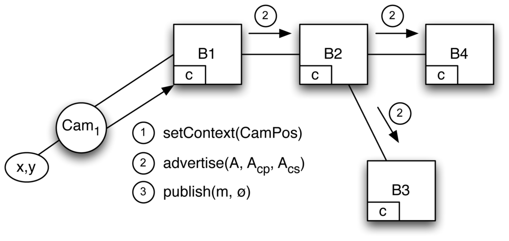 A camera is connected to the broker network, specifically to broker B1 whose advertisement and subscription tables are initially empty (see Figure 4). This camera establishes its initial context, namely its position, by invoking setContext(CamPos) with CamPos ≡ cvp = 〈xp = CamPos.x, yp = CamPos.y〉. However context updates from Cam1 will not be sent to the broker since their value is meaningful only when bound to a notification. Instead the last context will be held by the local API and appended to the sending message on each publish method invocation. As a matter of fact, our assumption in this scenario is that context changes are more frequent than notification/subscription messages.