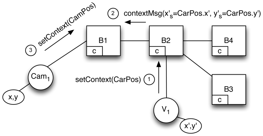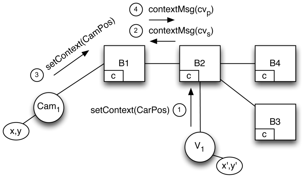 First, let us consider that V1 is driving along the highway and changes its context (see Figure 6) by sending setContext(CarPos). B2 processes this change of context with the help of the context manager, which replaces the values of xs and ys previously stored in the contextManager table.