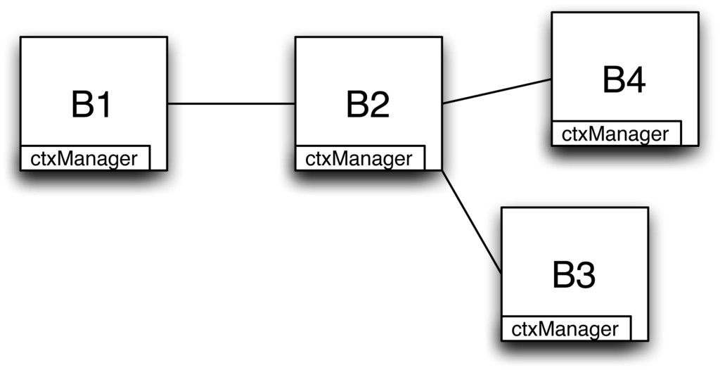 B2 receives the new context values cv′s ≡xs = CarPos.x′, ys = CarPos.y′〉, creates the and checks if it is different from the last value entered in the contextManager table. If it is, it updates the table with the new values, then looks up the outbound entries for used to send the context message in the subscription table and finds B1. If the new and old values are the same, no action is taken. Then B1 receives this context message and modifies its contextManager table accordingly; next it queries the subscription tables, repeating the process carried out by B2.