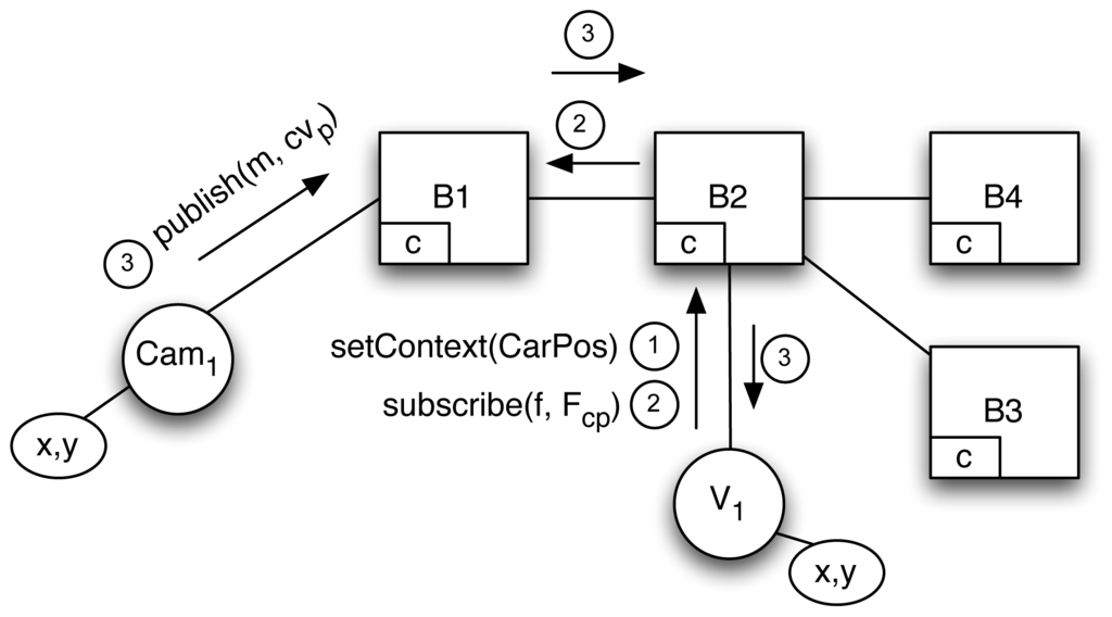 First of all, V1 accesses the P/S network as a client of B2 and sends its initial context, setContext(CarPos). B2 receives this information as a context message, extracts the cvs values and creates a UUID ( ) for V1, which it stores to its contextManager table as 〈 ; xs = CarPos.x, ys = CarPos.y〉. Then B2 checks, using the subscription table, to see if V1 context needs to be forwarded. In this case, no action is taken since the table is empty.