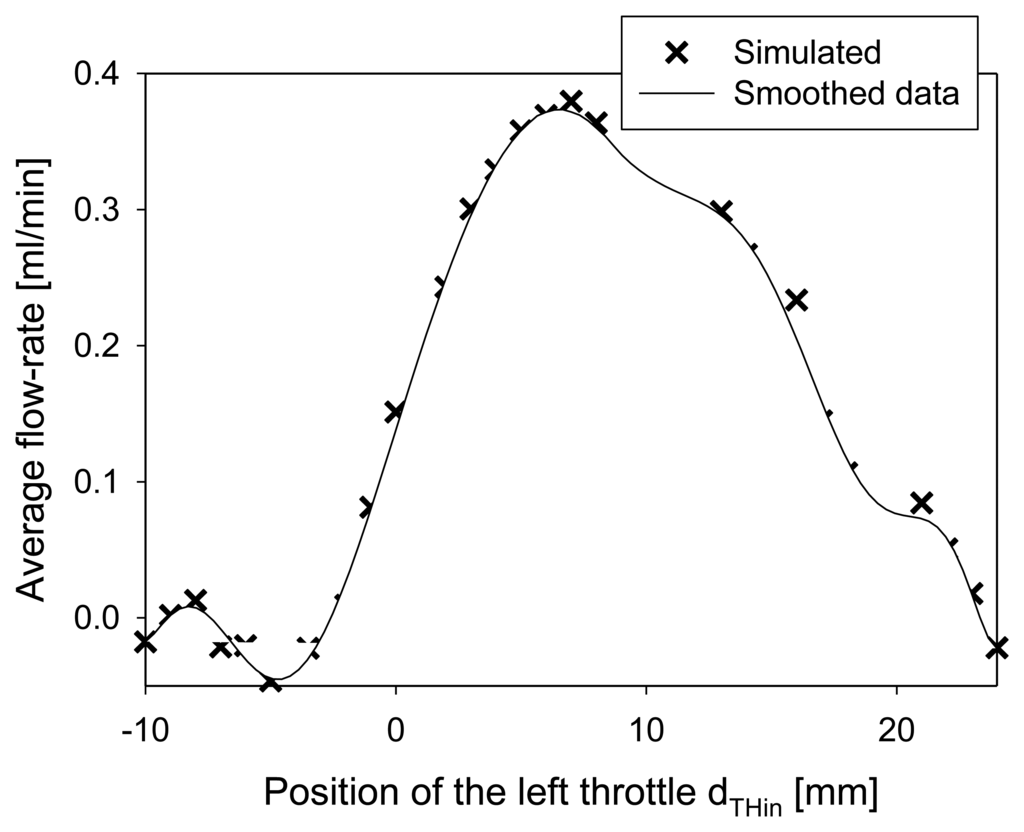 The optimal position of the right throttle was determined from the position of maximal negative membrane deflection which occurred at dTHout = 3 mm. The optimal position of the left throttle has been obtained from a study of average flow-rates at varying positions of the left throttle. As shown in Figure 10, maximal average flow-rate was obtained at dThin = 8 mm, which was thus chosen as a position of the left throttle in the design of a prototype device.