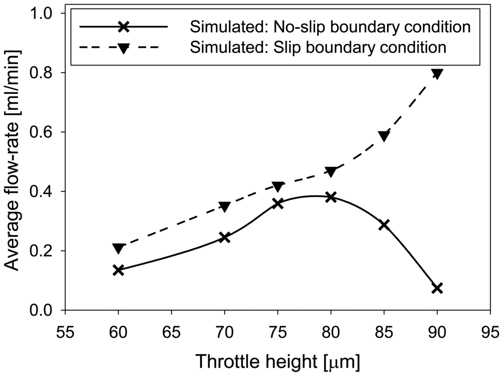 Influence of throttle height on average flow-rate was analyzed at optimized positions of the throttles determined in the previous paragraph for two different boundary conditions for the fluid velocity (Figure 11). For slip boundary condition the average flow-rate was increased at larger throttle heights. More realistic results were obtained for no-slip boundary condition resulting in maximum of average flow-rate at a throttle height of 80 μm (the total channel height was 100 μm) followed by a decrease for larger throttle heights. This decrease is a consequence of a very small opening at the throttles which due to zero fluid velocity at the boundaries (no slip boundary condition) additionally decreases the fluid flow.