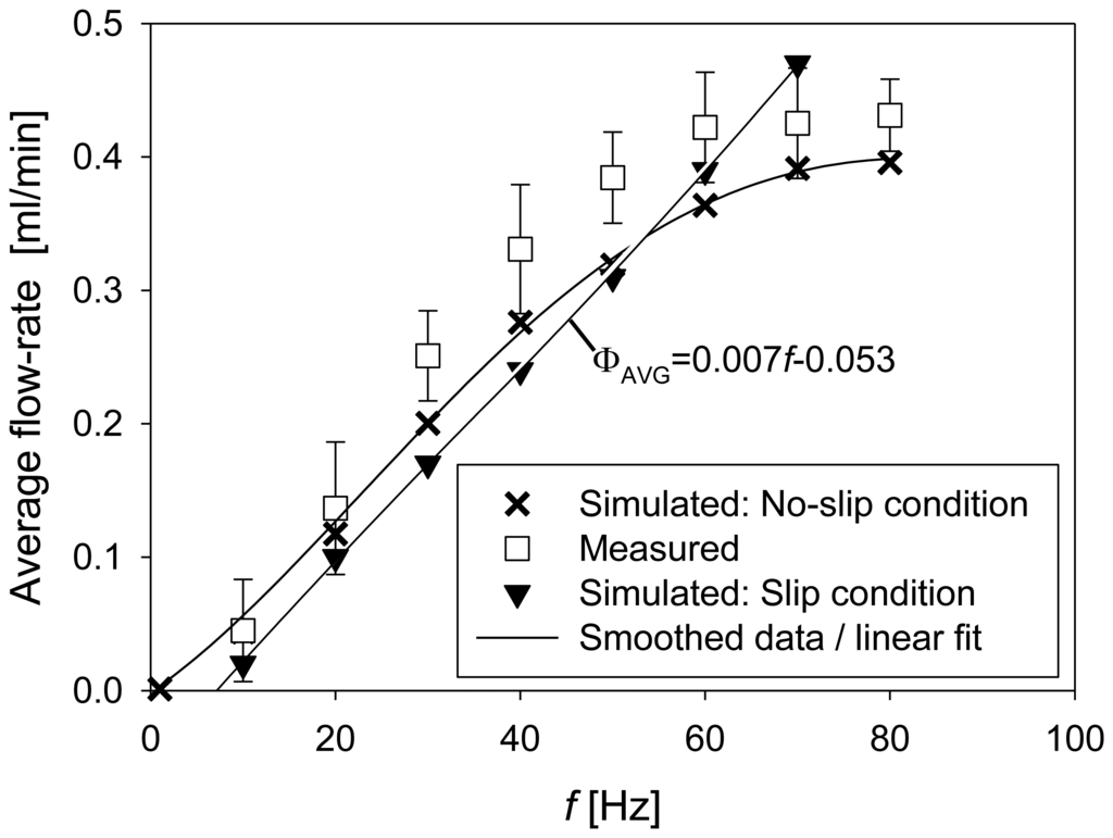 The average flow-rate is increased with increasing frequency of the excitation signal, as presented in Figure 12. Error bars represent the standard deviation derived from five measurements. Average flow-rates on a fabricated prototype increased approximately exponentially but can also be described as linear for frequencies below 50 Hz (at a rate of 0.0087 mL·min−1·Hz−1) saturating to a value of about 0.43 mL·min−1 at a frequency of 60 Hz. Numerical simulation results are shown for two different boundary conditions for the fluid flow at the channel walls. For the slip boundary condition a linear increase with frequency at a rate of 0.007 mL·min−1·Hz−1 was obtained and no saturation effect is observed. More realistic results were obtained for no-slip boundary condition resulting in a similar shape of average flow-rate increase but on average about 0.03 mL·min−1 smaller than experimentally determined. Average flow-rate saturated at a frequency of 70 Hz. The differences between the measurements and the simulation can be a consequence of several elements starting from non-ideal fabrication process to non-suitably chosen material parameters. In particular, the material parameters of the PDMS can vary substantially depending on the processing steps in particular on the curing temperature and the proportion of the curing agent [25]. Further increase of the excitation frequency may result in several additional effects that could influence device operation such as turbulent flow around the throttles, excessive heating of the fluid resulting in changes of the fluid viscosity or even fluid cavitation due to rapid changes in the pressure. The model used in the study does not cover these effects. Solver convergence was not problematic at lower frequencies (1 Hz) while at higher frequencies (above 10 Hz) additional solver tuning was necessary. At frequencies higher than 80 Hz convergence problems were encountered. The measurements were nevertheless performed up to a frequency of 500 Hz without a noticeable increase of the average flow-rate.