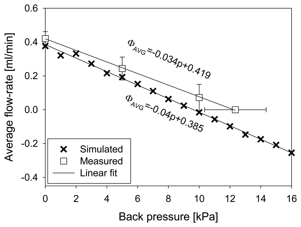 The throttles never completely close the channel during operation. For this reason they are additionally susceptible to the increased back pressure. Figure 13 shows experimental and simulation results of average flow rate dependency on backpressure, obtained at a frequency of 70 Hz and 300 V excitation signal. Error bars represent the standard deviation derived from five measurements. For simulation purposes, back pressure was applied on micropump outlet boundary as a pressure boundary condition. A linear decrease of average flow-rate was obtained in both cases. Experimentally determined rate of decrease was 0.034 mL·min−1·kPa−1 reaching zero at a back pressure of 12.4 kPa. The point of zero average flow was determined by the maximal height of the fluid column (DI water). Numerically obtained rate of decrease was 0.04 mL·min−1·kPa−1 reaching zero at a back pressure of 9.5 kPa.