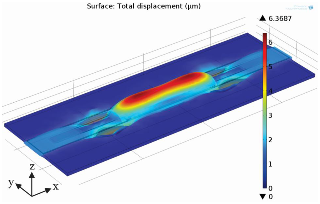 The piezoelectric was biased with a sinusoidal voltage signal of amplitude 300 V and a frequency of 1 Hz starting at time 0 s. Figure 4 presents maximal deflection of the membrane and the PZT occurring at maximal applied voltage (300 V). Maximal deflection is small (in the order of a few microns) so for visualization purposes membrane deflection is scaled up 500 times. In the region of a PZT the membrane deflects in the positive z direction. A saddle shape is a result of a magnitude of an applied signal and a length of a PZT and is typical for longer strip-type MT pumps (it cannot be observed in disk-type PZT actuators). On the other hand, the membrane deflects in a negative z axis direction away from the PZT edge. Four deflection maxima are observed at the corners of the PZT, which are a consequence of a rectangular shape of the PZT and increased electric field at the corners. Simultaneous membrane deflection in positive and negative z axis is a key element that enables sequential opening and closing of the throttles during device operation. For proper device operation one of the throttles is positioned in the region of maximal positive membrane deflection, while the other one on the opposite side in the region of maximal negative membrane deflection. The shape of the membrane deflection therefore strongly influences device operation and optimization of design parameters—in particular in proper positioning of the throttles.