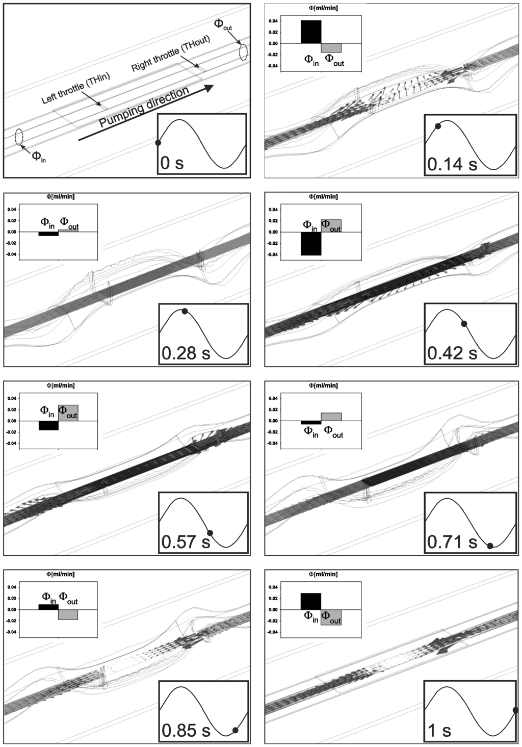 The pumping phase continues also through the third quarter of the period when the membrane deflects in the negative z axis (toward the bottom of the channel) and further presses the fluid towards the outlet (time frame 0.57 s and 0.71 s). This is a consequence of further closure of the left throttle and opening of the right throttle. Also during this time period the flow is observed in both directions, however, it is larger towards the outlet than the inlet. During the fourth quarter of the period the membrane deflection reduces resulting in a repetition of the suction phase. During this time the negative fluid flow-rate at outlet is observed once again (time frame 0.85 s).
