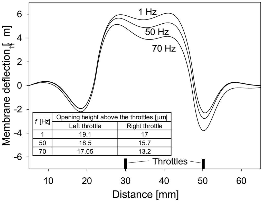 The pump operation at higher frequencies (10 Hz–70 Hz) of the applied excitation signal differs substantially from the low frequency operation (1 Hz) due to differences in the speed and shape of the membrane deflection, which result in different maximal volumes between the throttles and opening heights at the throttles. Figure 7 presents deflection of the membrane in the middle cross-section along the channel at maximal excitation signal (300 V) for three frequencies of the applied signal: 1 Hz, 50 Hz and 70 Hz. Membrane deflection is reduced at higher frequencies leading to reduced maximal volume between the throttles. This could result in less efficient pumping, however, at the same time the opening height above the throttles is reduced which results in more efficient closure of the throttles and thus more efficient pumping. Figure 7 also indicates that the position of maximal negative and positive deflection depends on the frequency of the applied signal (and also on the magnitude of the applied signal, but this is not shown in the figure). This is important as these positions can be used to determine optimal positions of the throttles.