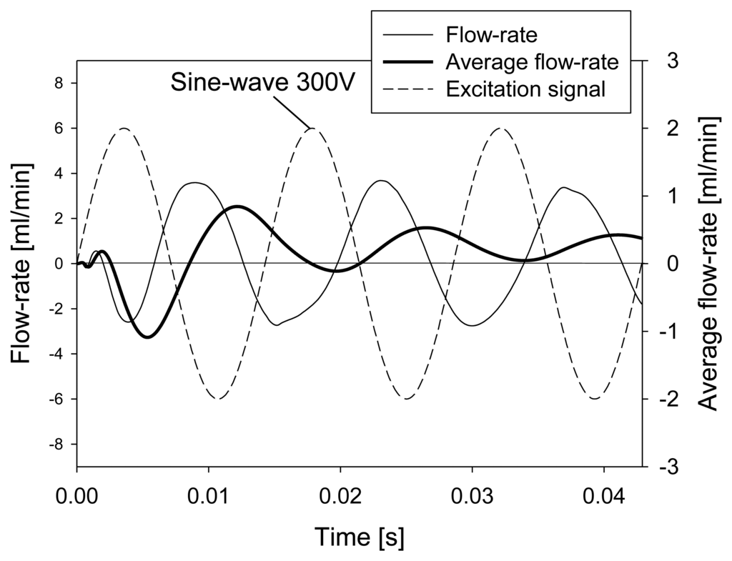 Average flow-rate at the outlet can be computed from simulation results by time integration of the outlet flow-rate divided by the integration time. These results are presented together with the applied excitation signal and the flow-rate in Figure 6. As already explained, the flow-rate is negative during the first and the fourth quarter and positive during the second and the third quarter of the period. A time lag (phase shift) of about a quarter of a period between the excitation signal and the net flow-rate at the outlet can be observed. This result is expected, as the membrane deflection is in phase with the excitation signal, while the flow-rate is zero during maximal membrane deflection. Furthermore, the flow-rate is maximal during times of maximal change of membrane deflection which occurs when the excitation signal changes polarity. Time averaged flow-rate results in net pumped volume, which is for 1 Hz/300 V excitation slightly positive after one period indicating proper device operation but with poor performance (about 0.0015 mL·min−1).
