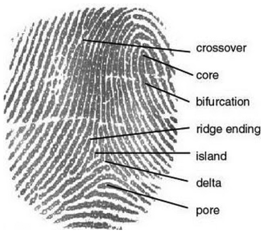 Fingerprints have been used as a personal identification tool for a long time because of their uniqueness and time invariance. A fingerprint comprises ridges and valleys that correspond to the dark and white areas in the gray-level image. Figure 1 shows the structure of a fingerprint which includes examples of a crossover, core, bifurcation, ridge ending, island, delta and pore.
