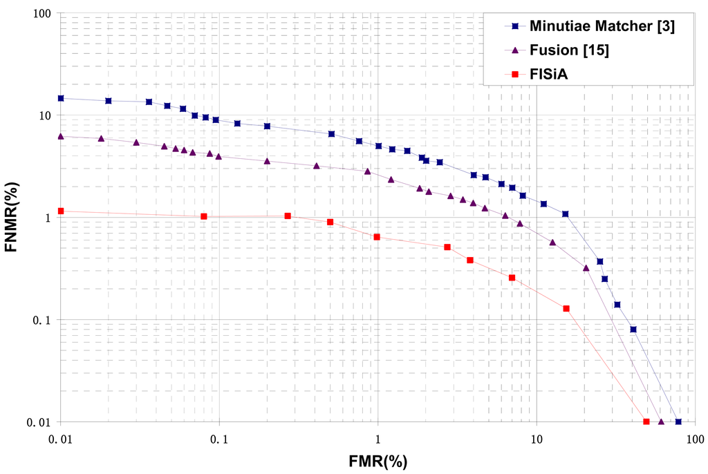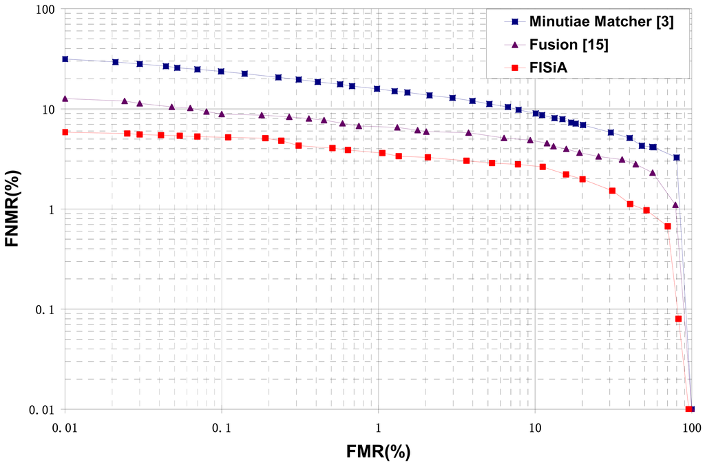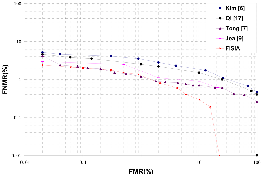 A number of previous studies [6,7,9,17] that utilize both minutiae and additional data to improve accuracy are discussed in the introduction. The ROC curves of FISiA and other related methods on FVC2002 DB1 are shown in Figure 14. Experimental results showed that our proposed FISiA is not only suitable for the specific fingerprints, but also can deal with the normal fingerprints.