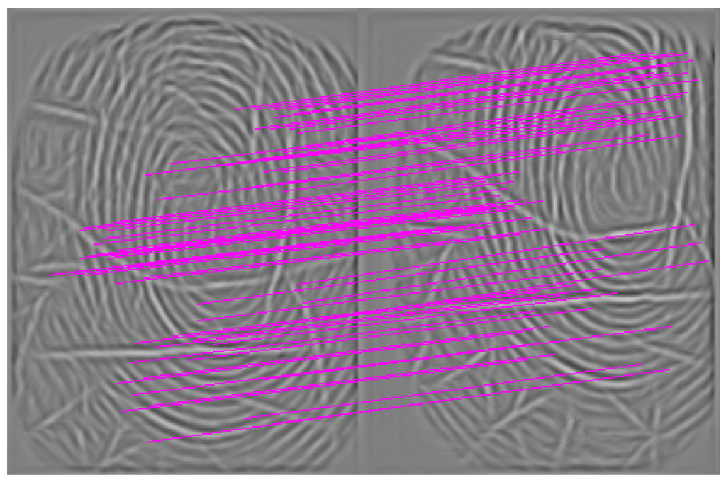 In the previous work [15], the algorithm was based on point-wise matching, followed by the trimming of false matches. Point-wise matching in [15] rejects the closest neighbor if the ratio of the Euclidean Distance of the closest neighbor (d1) and the second closest neighbor (d2) is too high (higher than the threshold). For the trimming of false matches, two fingerprint images were placed side by side, and lines between each matched pair were connected. The orientation and length of the connected lines in majority are collected as a standard. The matches having orientations and lengths different from the standard are trimmed. The matching score is calculated by counting the lines which are similar with the standard.